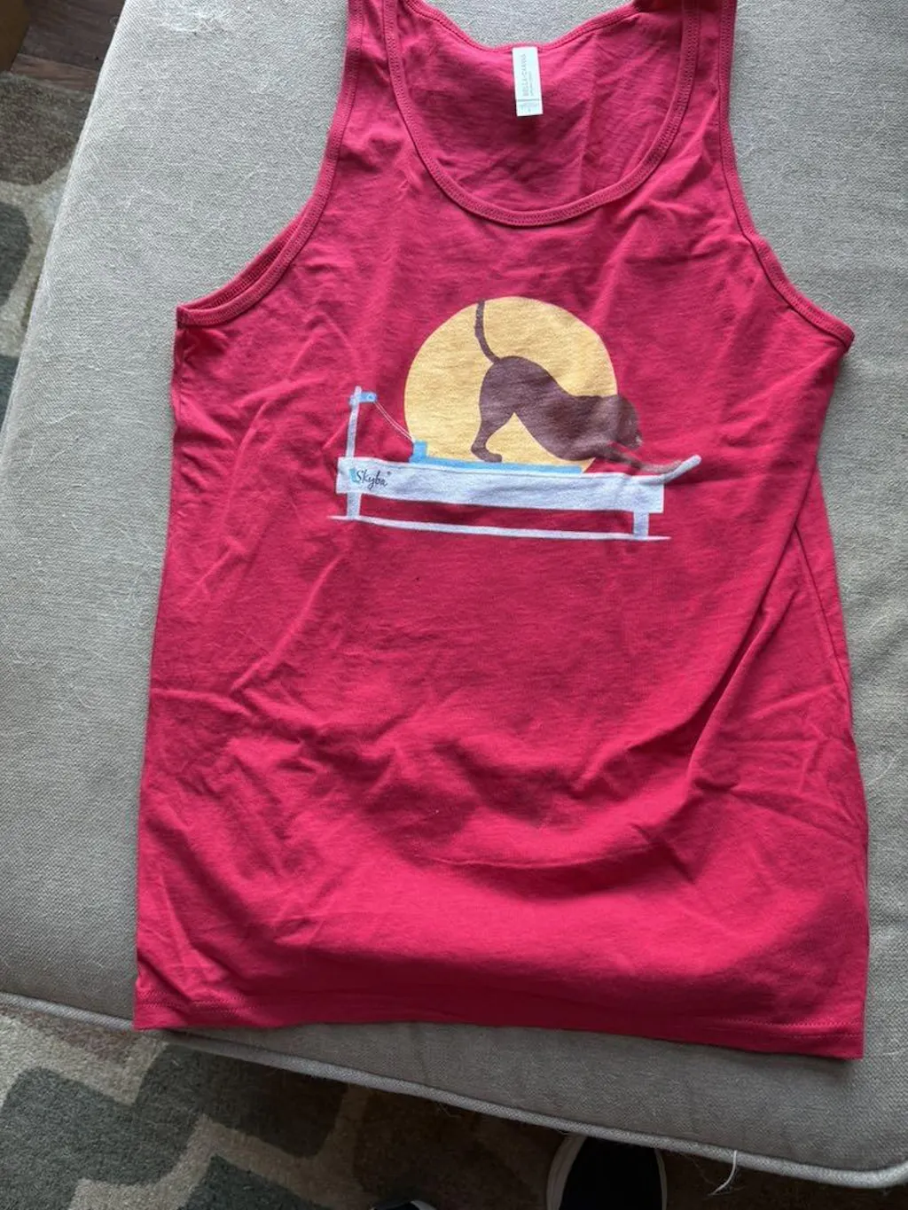 First of all, the graphic is adorable. I received the wrong size (S). It IS my goal, like the Lab’s position on the reformer! Customer Service PROMPTLY addressed the issue, and the proper one is on the way. Easy peasy! I’ve already shared the link with friends who are intrigued, despite not having seen it in person. I’ll be back myself.